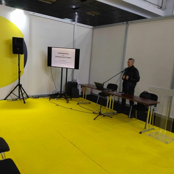 Ученици су слушали предавање др Предрага Живковића, професора Технолошко-металуршког факултета у Београду, Стандардизација у штампарији офсет штампе.