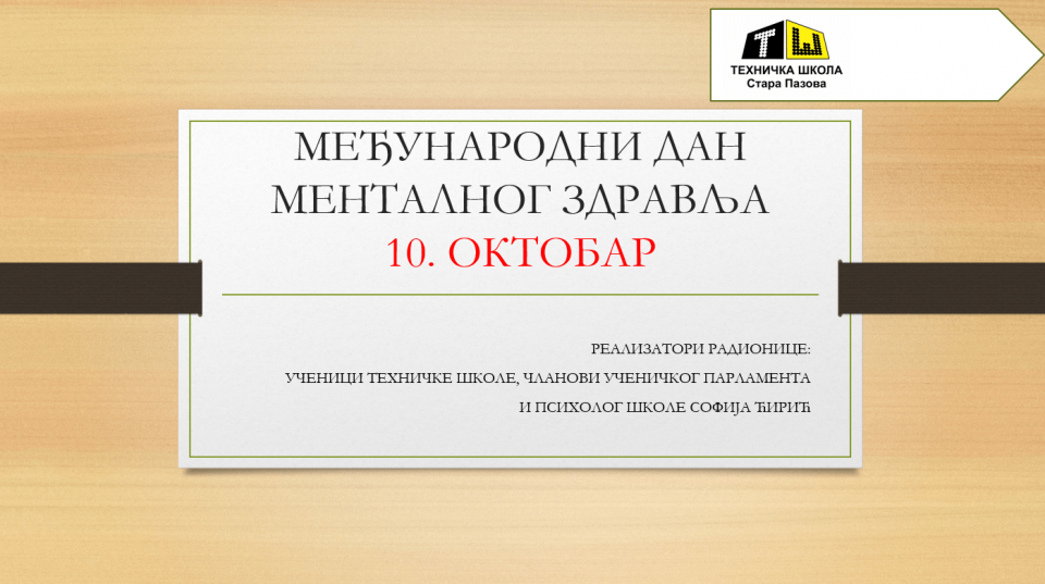 У периоду од 9.10.-10.10. 2025. године ученици Ученичког парламентa Техничке школе, у сарадњи са психологом, промовисали су важност бриге о менталном здрављу. Наиме, чланови парламента организовали су радионице на тему – Како са стресом, и то ученицима првих разреда.