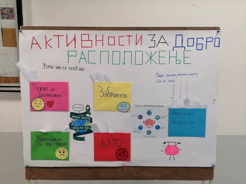 На паноу, изложеном у холу наше школе, налази се листићи са цитатима и порукама: шта ученици да раде када се осећају тужно, немотивисано, забринуто, узнемирено и под стресом. У зависности од тога како се осећају, ученици могу да узму поруку из коверте која одговара њиховом расположењу. На другом паноу, на сликовит начин, дате су опште информације везане за ментално здравље младих као и предложени начини на које се стрес и брига могу умањити.