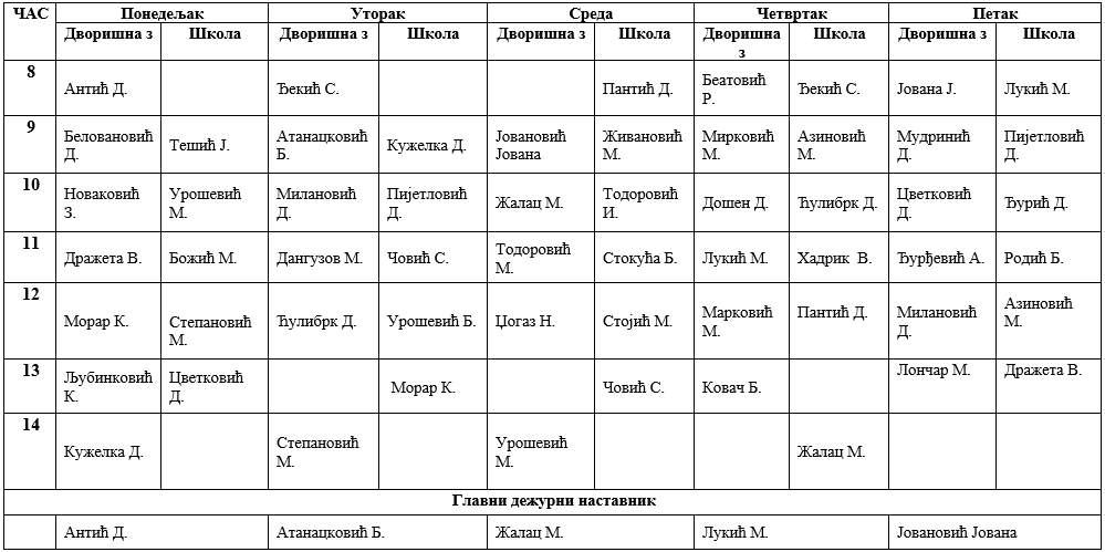 • Дежурство у школи изводе дежурни наставници и помоћно-техничко особље у складу са процесом наставе.