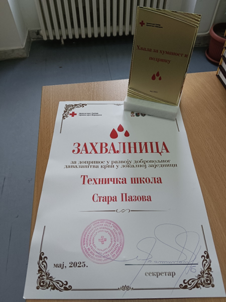 У петак, 9. маја 2025. године, Црвени крст Војводине организовао је у Новом Саду обележавање – Националног дана добровољних давалаца крви. Свечаност је одржана у свечаној сали Црвеног крста Војводине, где су уручена признања многим компанијама, установама и удружењима који су дали изузетан допринос у обезбеђивању јединица крви. Присутнима се обратио председник Црвеног крста Војводине Дејан Укропина. Том приликом је Техничкој школи додељена плакета за хуманост и подршку. Са Црвеним крстом остварујемо добру сарадњу и радо се одазивамо на позиве за различите хуманитарне акције, као и акцију добровољног давања крви.
